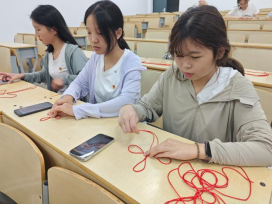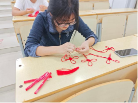 活动前夕,志愿者们围坐桌前,以红绳为弦,巧手为梭,奏响了一曲联结温情的非遗乐章。每一次缠绕都饱含专注,每一个绳结都凝结心意,诉说着对老人们的真挚祝福。志愿者们仔细比对、耐心调整,让传统中国结技艺重现光彩。他们坚信,这些寓意吉祥的中国结,终将为老人们的日常增添一抹喜庆与暖意。