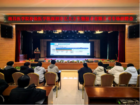 为深化校企合作、搭建高效人才对接平台,帮助学生精准把握行业需求、提升就业竞争力,南昌医学院检验医学院于2025年12月23日晚,在象湖校区大学生活动中心二楼举办了深圳市亿立方生物技术有限公司专场招聘会。本次招聘会采用“线上直播+线下互动”相结合的创新模式,旨在打破时空限制,为学生提供更便捷、更深入的就业对接体验。